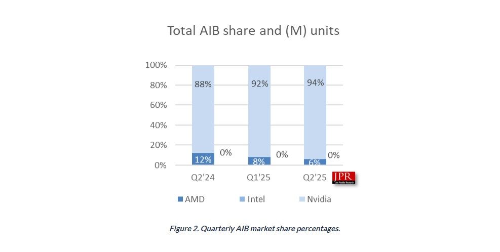 El Dr. Jon Peddie, presidente de JPR, dijo: «Los precios de AIB cayeron para el nivel medio y de entrada, mientras que los precios de AIB de gama alta aumentaron y la mayoría de los proveedores minoristas se quedaron sin existencias. Esto es muy inusual para el segundo trimestre. Creemos que es una continuación de los precios más altos esperados debido a los aranceles y los compradores que intentan adelantarse a eso».