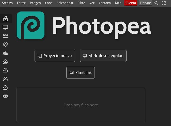 - Abrir desde el equipo. Si ya tienes un gráfico guardado en tu computadora, desde este acceso lo puedes cargar para hacerle los ajustes necesarios. También está la posibilidad de arrastrar tu archivo directamente a la interfaz principal de Photopea.