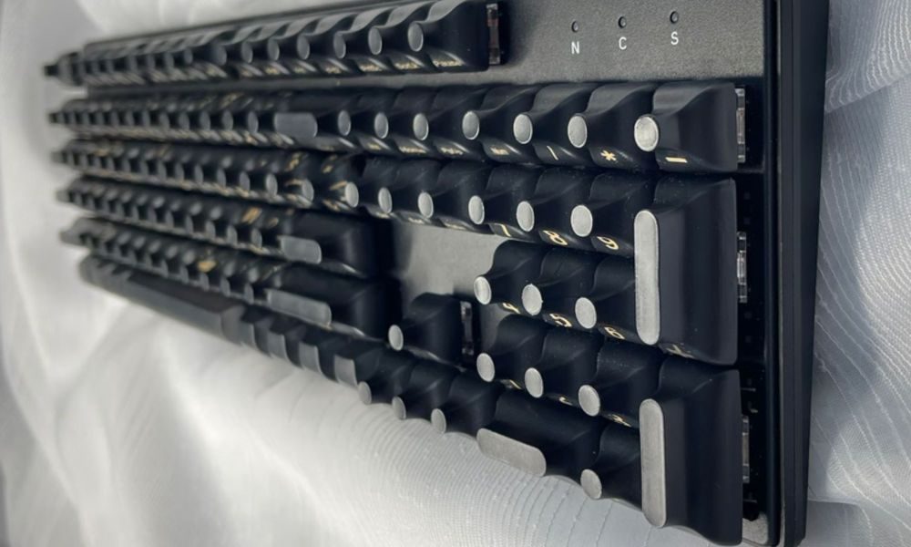 DeLiz es un teclado mecánico de tamaño completo que tiene teclas esculpidas de forma única, que se parecen inquietantemente al chocolate Hershey’s Kisses debido a su pronunciada forma de lágrima. Estas teclas especiales, sin embargo, cuentan con una parte superior aplanada con un contorno redondo y una superficie ligeramente empotrada. Y sí, se ve diferente a cualquier teclado que haya visto en mi vida.