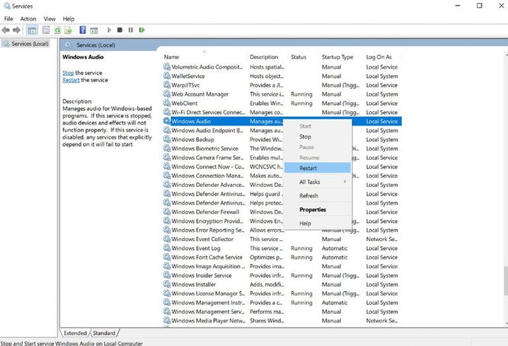 Paso 2: La nueva ventana mostrará una larga lista de servicios en Windows 10. Baja hasta encontrar específicamente Windows Audio. Haz click en el botón derecho del mouse en Windows Audio y elige Reiniciar desde las opciones disponibles.