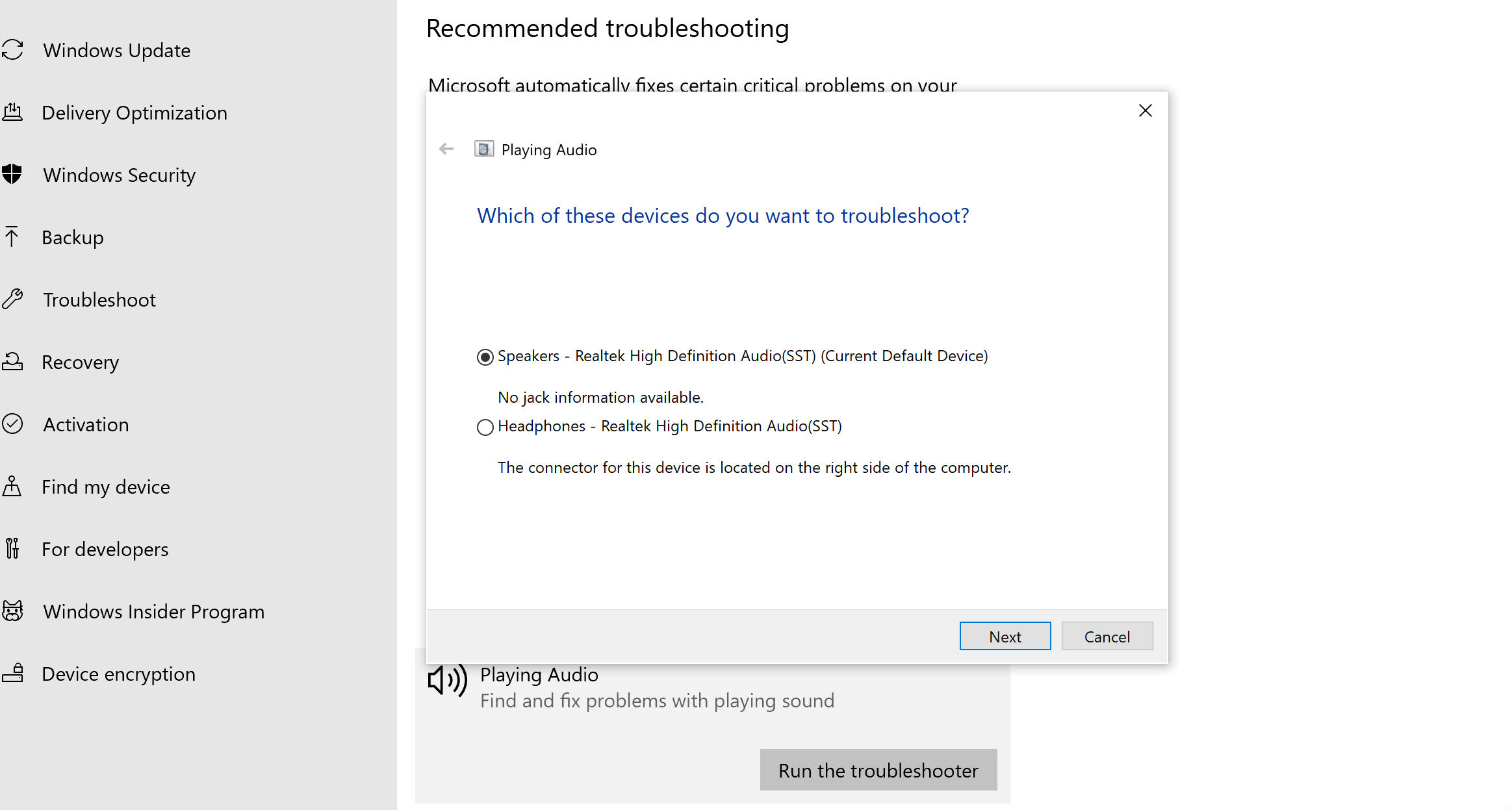 Paso 3: se abrirá un nuevo icono de solucionador de problemas en la barra de tareas. Selecciónalo para abrir la nueva ventana. Ahora tendrás la opción de solucionar diferentes tipos de problemas en los altavoces conectados, incluidos los altavoces y auriculares incorporados. En la mayoría de los casos, querrás elegir tus altavoces predeterminados, pero puedes personalizarlos en tu dispositivo. Selecciona Siguiente cuando hayas terminado.