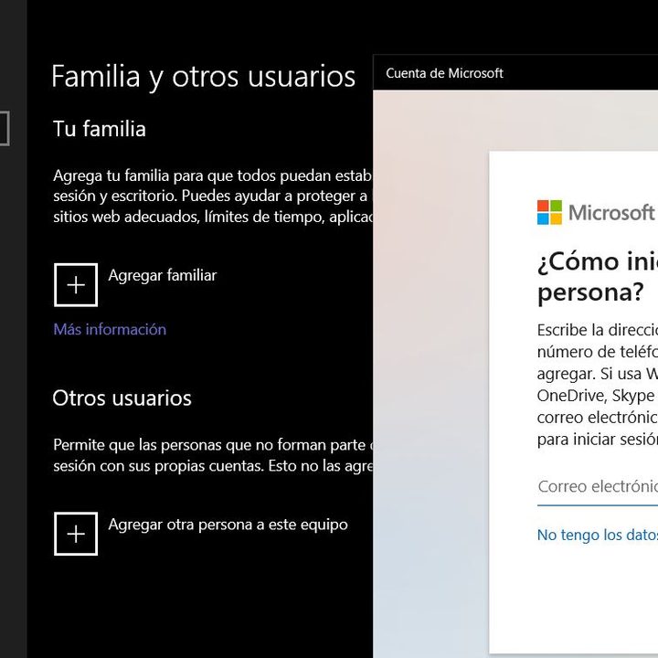 Para ello, haz clic en Inicio y ve a Configuración > Cuentas > Familia y otros usuarios. En Otros usuarios, haz clic en Agregar otra persona a este equipo.