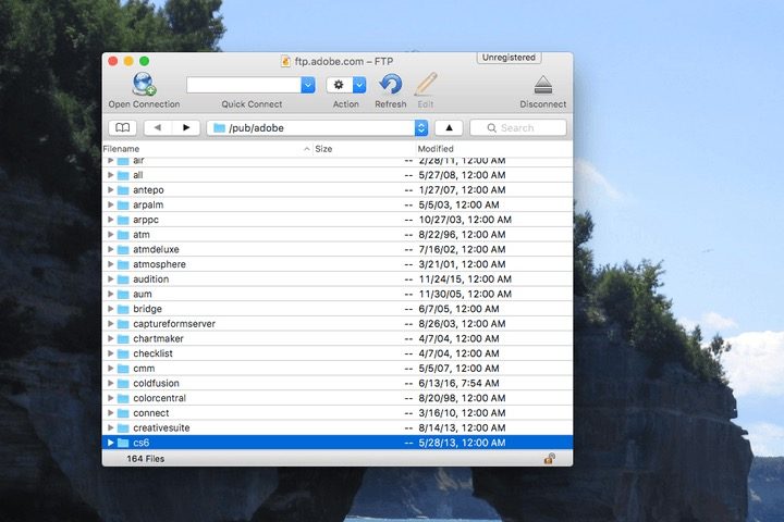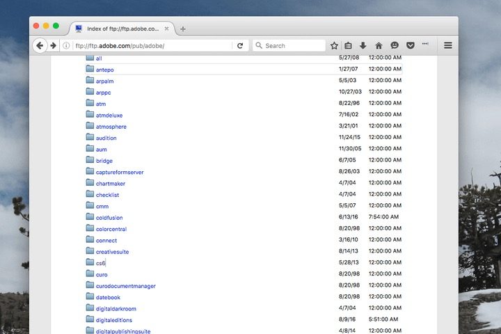 Puedes tener una idea de esto al navegar en un servidor FTP público. Por ejemplo, Adobe ofrece descargas de todo su software a través de FTP para los clientes que poseen software como Photoshop con una clave de producto válida, pero que no tienen a la mano su CD de instalación. Los navegadores como Chrome y Firefox también admiten la exploración de servidores FTP (aunque no la carga de archivos).