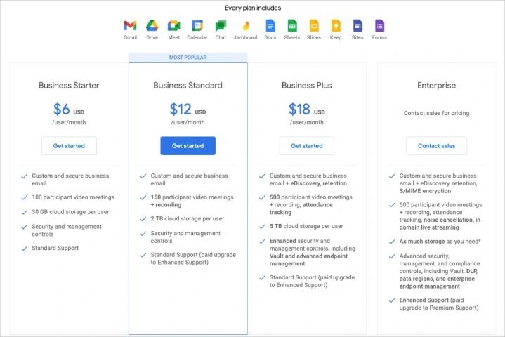 Business Standard ($12 por usuario al mes): correo electrónico personalizado, reuniones de video para 150 participantes con grabaciones, 2 TB de almacenamiento en la nube por usuario y soporte estándar con una actualización opcional