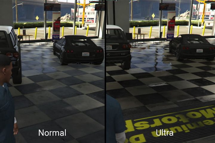 Los juegos sin Trazado de rayos dependen de la iluminación estática «horneada». Los desarrolladores colocan fuentes de luz dentro de un entorno que emite luz de manera uniforme en cualquier vista. Además, los modelos virtuales como NPC («Personaje no jugable», por sus siglas en inglés) y los objetos no contienen información sobre ningún otro modelo, lo que requiere que la GPU calcule el comportamiento de la luz durante el proceso de renderizado. Las texturas superficiales pueden reflejar la luz para imitar el brillo, pero se trata solo de una luz emitida por una fuente estática. Tomen como ejemplo los reflejos de GTA V, en la foto a continuación.