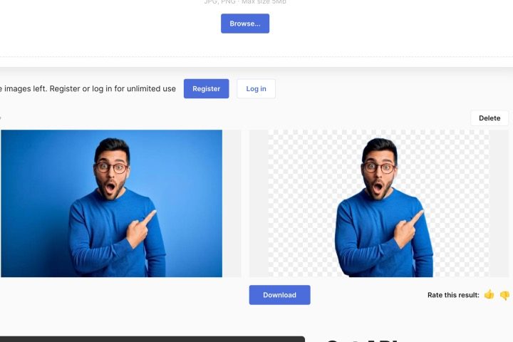 Paso 3: la herramienta generalmente tarda unos minutos en procesar la imagen y luego te dará una imagen PNG fácil con el fondo recortado. Es la herramienta más precisa que hemos encontrado, pero las imágenes borrosas o demasiado ocupadas pueden no ser tan nítidas, en cuyo caso probablemente deberías usar una de las otras soluciones que analizamos a continuación.