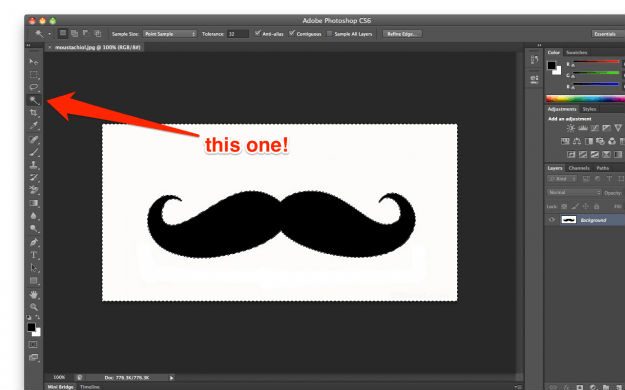 Paso 3: es el momento de seleccionar una parte de la imagen; en este caso, el bigote negro que se ve arriba. Al hacerlo, se verá un borde entrecortado alrededor de esa zona de la imagen.