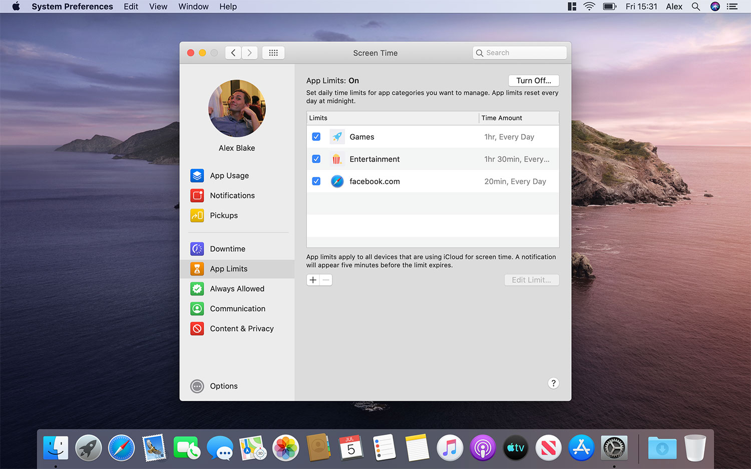 Si observas que tus hijos pasan demasiado tiempo usando ciertas aplicaciones o sitios, puedes hacer algo al respecto: activa Límites para Apps en la columna de la izquierda. Luego puedes decidir qué aplicaciones limitar, ya sea de forma individual o por categorías. Haz clic en el botón + para agregar algo. Aparecerá una ventana mostrándote categorías de aplicaciones como Juegos, Redes Sociales y Entretenimiento, con detalles de tu uso promedio cotidiano de cada categoría. La flecha que hay junto a cada categoría la expande, permitiéndote seleccionar apps individuales.