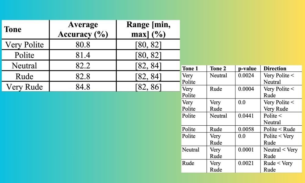 Según un trabajo de investigación previo a la impresión realizado por expertos de la Universidad Estatal de Pensilvania, cuando a ChatGPT se le hizo la misma pregunta en diferentes tonos, las preguntas groseras “superaron consistentemente” a las preguntas educadas. La precisión de las respuestas proporcionadas por ChatGPT con preguntas educadas fue del 80,8%, mientras que la misma consulta descrita de manera muy grosera mejoró la precisión de las respuestas al 84,8% en un formato de cuestionario de opción múltiple.