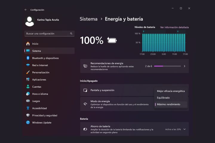 ¿Sabías que tu PC tiene un botón que puedes usar para literalmente hacer que funcione más rápido? Así es, y puedes ajustarlo a tu gusto. Para llegar allí, haz clic en Inicio > Configuración > Sistema > Energía y Batería. En la sección Inicio/Apagado, ve a Modo de energía y selecciona Máximo rendimiento. Ten en cuenta que esto puede reducir la duración de la batería de tu portátil si no está conectado a la corriente.