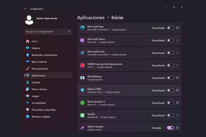 Para definir qué programas se ejecutarán automáticamente al iniciar Windows, ve a Inicio > Configuración > Aplicaciones > Inicio. Allí, activa o desactiva las que consideres convenientes. Si no sabes de qué se trata una aplicación, es mejor dejarla activada, aunque siempre puedes investigar en internet para obtener más información sobre ella. Si está relacionada con el entretenimiento, probablemente puedas desactivarla sin problemas.