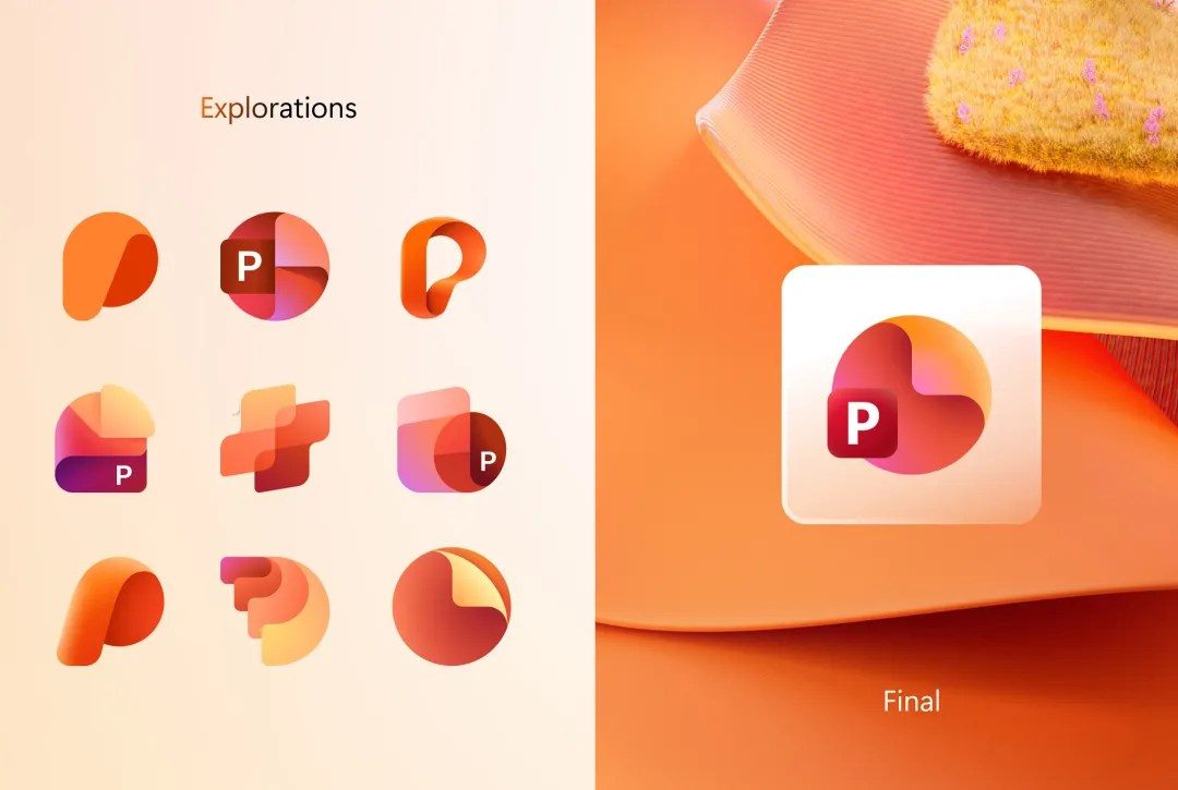 PowerPoint siempre se ha tratado de diapositivas, y Microsoft experimentó con una variedad de formas de visualizarlo para su último ícono de PowerPoint. Un par de conceptos se centran en las letras, convirtiéndose en una letra P o P en forma de cinta con un gráfico circular colgando de ella. Sin embargo, el diseño final del ícono es mucho más dócil, con una versión un poco más redondeada y colorida del ícono actual de PowerPoint.