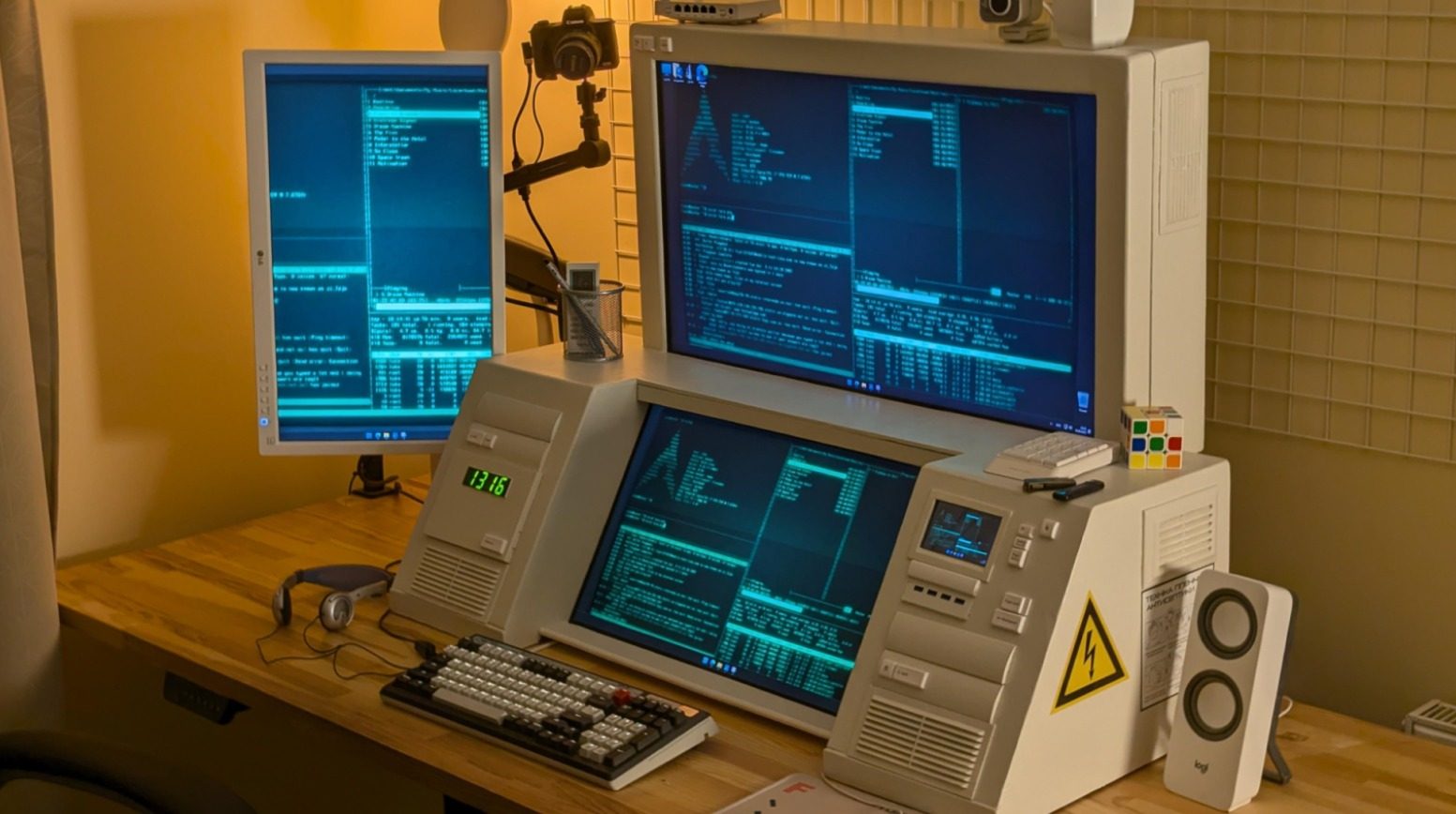 Según los comentarios del creador, el monitor lateral de un brazo VESA normal es de 23 pulgadas, por lo que supongo que la pantalla inferior es de 27 pulgadas y la superior (mencionada como 2K) es de 32 pulgadas. La pantalla más pequeña es una LCD de 4 pulgadas (que parece estar conectada al sistema principal de Windows), y la lectura de números es un reloj digital. No hay impresión 3D involucrada.