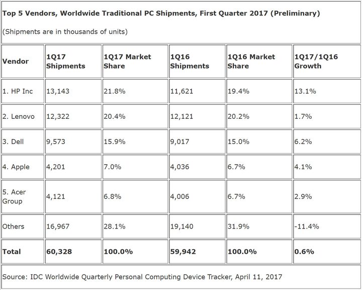 Según IDC, las ventas de PCs para el primer trimestre alcanzaron 60,328 millones de unidades, un aumento del 0,6 por ciento comparado con el primer trimestre de 2016, cuando se vendieron 59,945 millones de unidades.