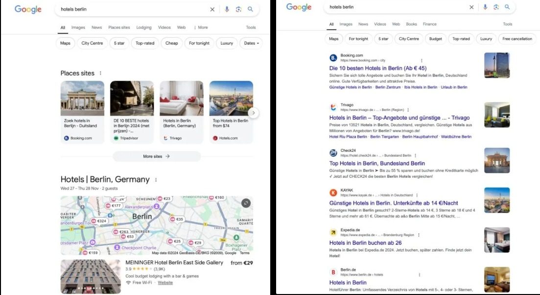 Google ha anunciado que está llevando a cabo una “breve prueba” sobre cómo muestra los resultados de búsqueda en la Unión Europea. Para los usuarios de Alemania, Bélgica y Estonia, la Búsqueda de Google eliminará los resultados enriquecidos en torno a los hoteles y volverá a una lista de enlaces de sitios web similar al antiguo formato de “diez enlaces azules” de los primeros días de Google.