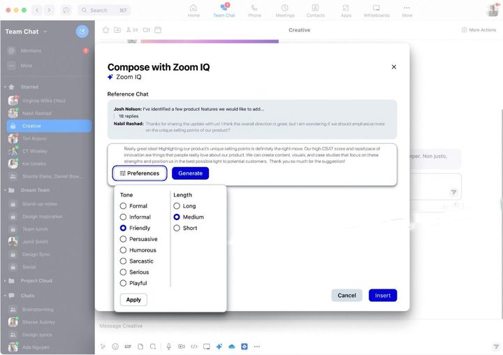 Las novedades: trae resúmenes generados por IA, borradores de mensajes y más a la aplicación de videoconferencia a través de su asistente impulsado por IA Zoom IQ.