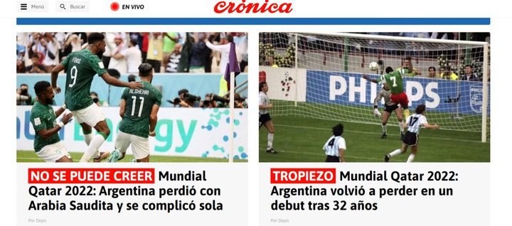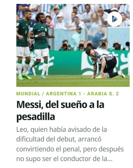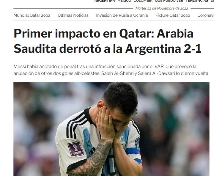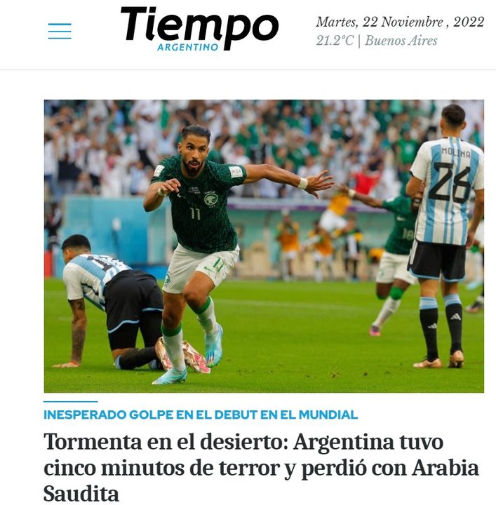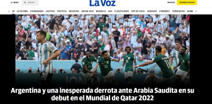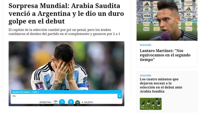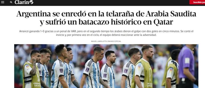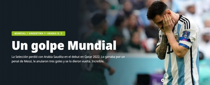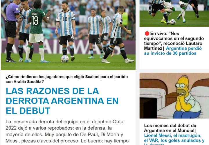 Por su parte Olé comentó “Golpazo. Así de frente contra la pared. De esos que te van a dejar la marca un tiempo largo. Porque el resultado, de verdad, ya casi es lo de menos. La falta de reacción, la ausencia de juego asociado, la inexistencia de presión, la poca solidez defensiva son todos ejes que no se posaban sobre este equipo. Argentina perdió mucho más que un partido contra Arabia Saudita. Se olvidó en el vestuario sus propios principios futboleros y arrancó el Mundial de la peor manera”.