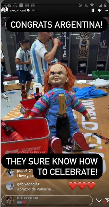 Uno de los actores protagónicos de las películas del muñeco asesino, Alex Vincent, realizó una publicación al ver a Chucky entre los campeones. “Felicitaciones Argentina. Veo que saben cómo festejar”, redactó el estadounidense en una historia de Instagram.