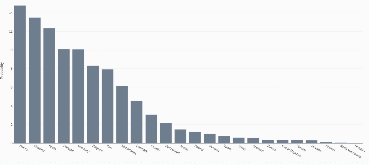 Los resultados muestran que Francia, actual campeón del mundo, también es el favorito para el título europeo con una probabilidad de victoria de 14.8 por ciento, seguido de Inglaterra con 13.5 por ciento y España con 12.3 puntos porcentuales.