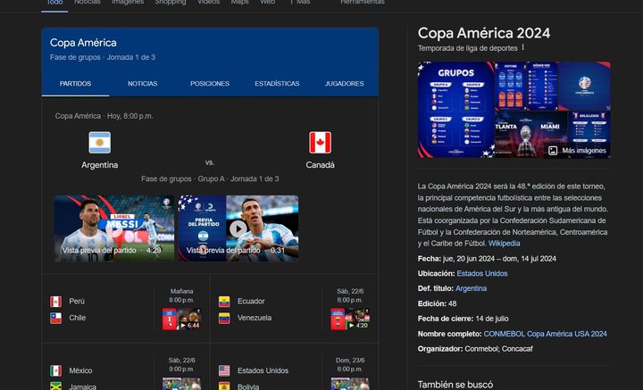 Para no perderse ningún partido, al ingresar el término “Copa América” en el Buscador, aparecerá un apartado con la fecha, horarios y estadio de cada partido. En tiempo real, se mostrará información de los jugadores, la formación de los equipos y estadísticas minuto a minuto con las probabilidades de victoria de cada equipo.