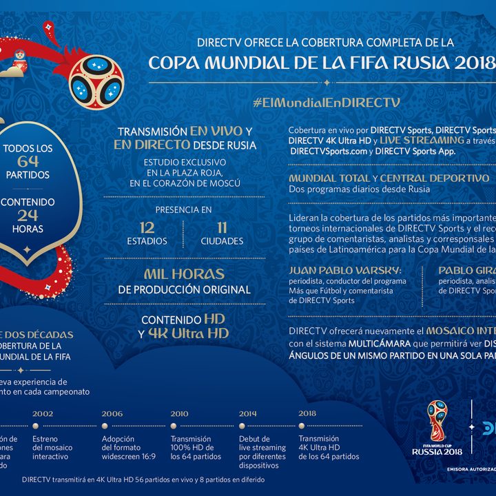 No obstante, lo que invertirá DIRECTV en esta cobertura especial del Mundial es una información confidencial que no se ha hecho pública, aunque la compañía destaca que “se invierte todo lo necesario para ofrecer esta gran experiencia” a su cartera de clientes.