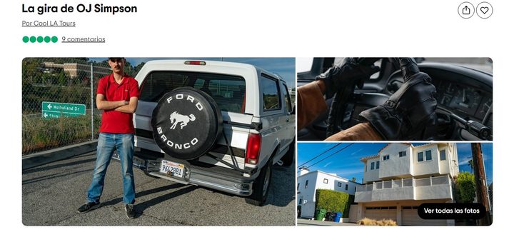 «Si está intrigado por los detalles del juicio de OJ Simpson, vea dónde tuvo lugar el crimen más infame de la década de 1990 en una gira de crímenes reales en Los Ángeles. Pase por lugares como el restaurante Mezzalona, la escena del asesinato del condominio Rockingham y más, todo mientras viaja en un Ford Bronco blanco. El recorrido profundo y respetuoso está dirigido por un nativo de Brentwood y reconocido experto local en el «juicio del siglo»», explica el aviso.