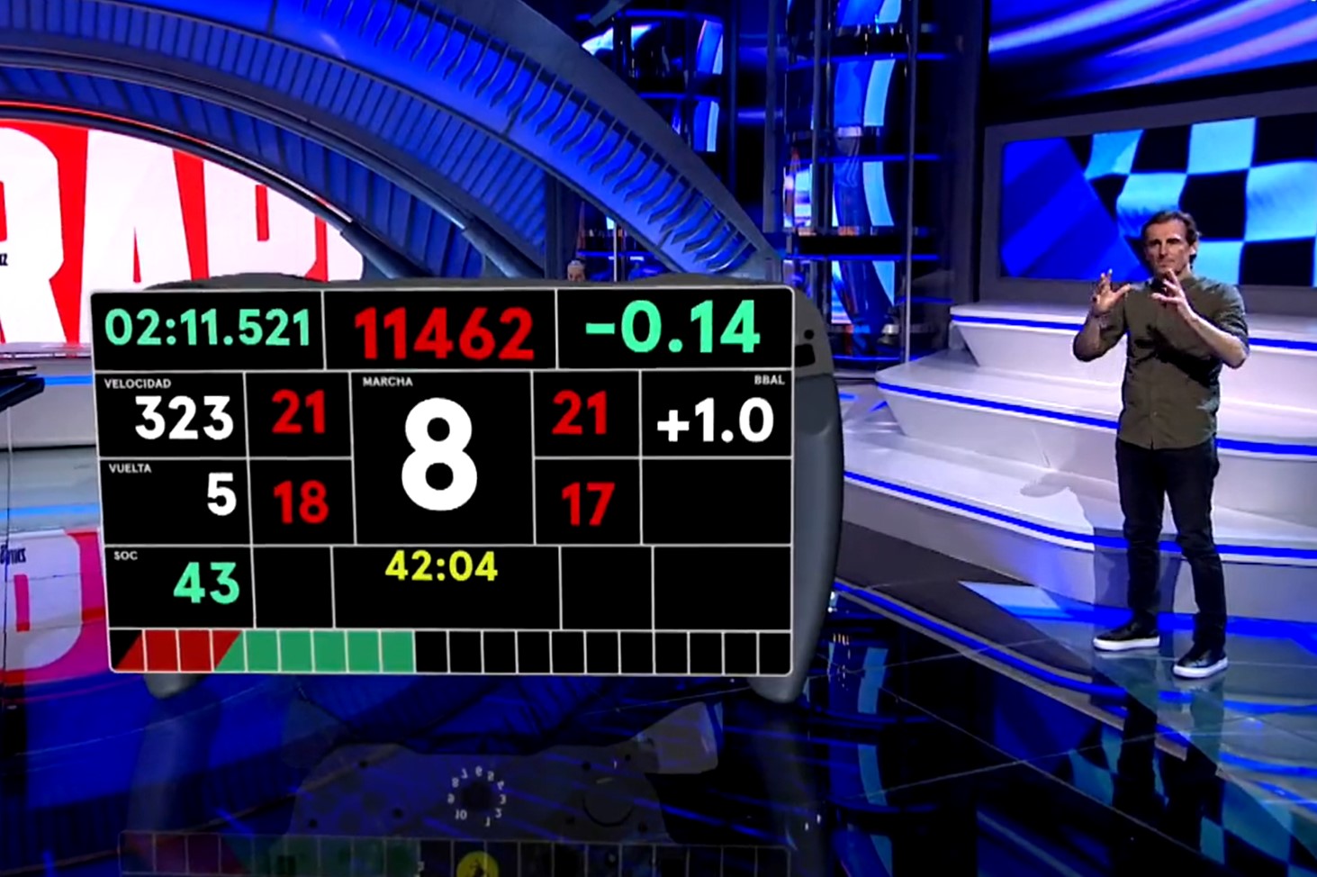 En la cuarta línea, el display entrega en el centro una cuenta regresiva con el tiempo restante de la sesión de práctica o clasificación. Al final, a todo lo ancho de la pantalla, se encuentra una barra en rojo y verde, como la de un celular o una laptop. “Dice la cantidad de energía que tienes para la vuelta qué estás haciendo”, finalizó.