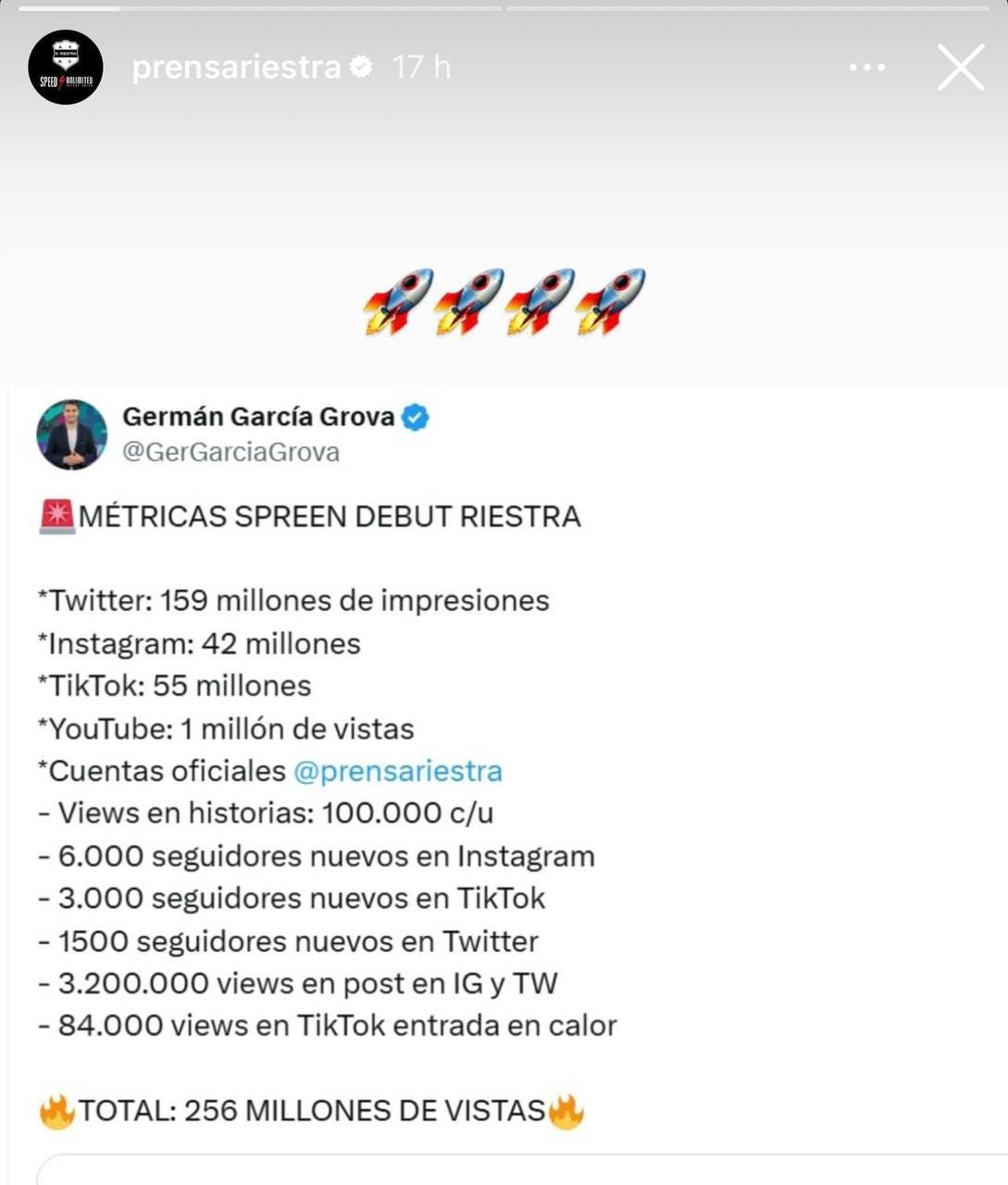 Deportivo Riestra es un club humilde en el fútbol argentino. Fundado en 1931, y del barrio de Nueva Pompeya en Buenos Aires, su estadio el Guillermo Laza de Villa Soldati tiene solo capacidad para 3.000 espectadores y su palmarés indica que siempre estuvo en categorías menores del ascenso, hasta su primera incursión en la Primera División este 2024. Sin embargo, el pasado 11 de noviembre hizo historia al aumentar sus visualizaciones en redes sociales más de lo que cualquier equipo grande como River o Boca Juniors quisieran, solo alineando por 78 segundos a un streamer de nombre Spreen.