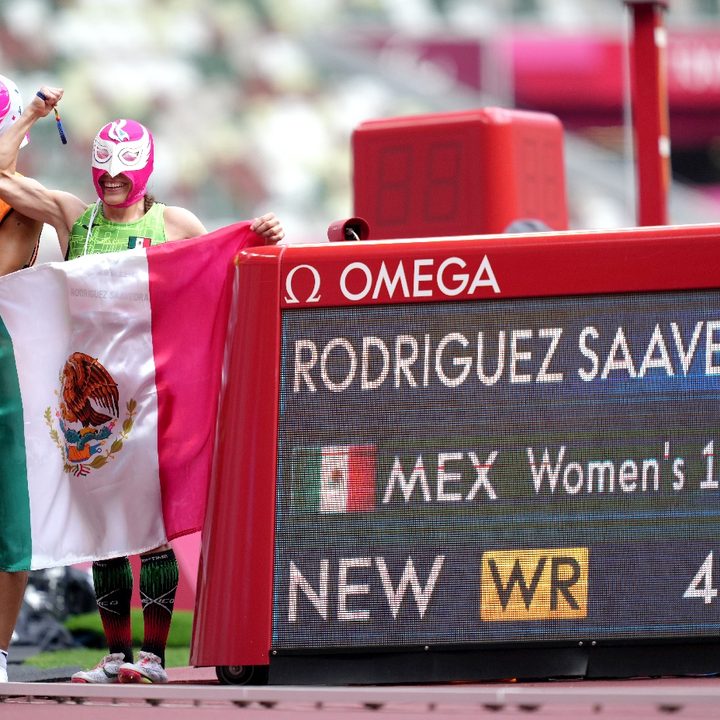 La mexicana Mónica Olivia Rodríguez Saavedra y su guía posan junto al marcador con el nuevo récord mundial en la final de 1,500 metros femeninos en la categoría T11 para atletas con discapacidad visual.