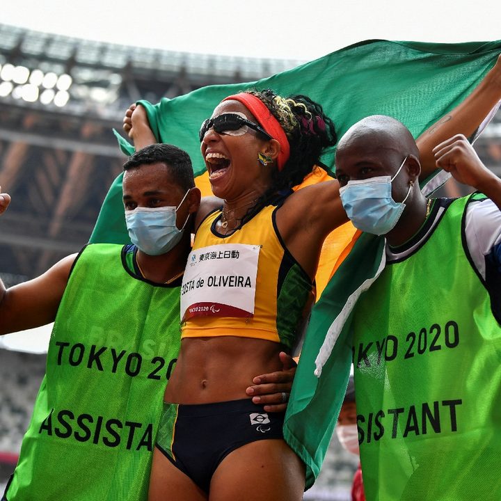 La brasileña Silvania Costa de Oliveira celebra su victoria tras la competición final de salto de longitud femenino en la categoría T11 para atletas con discapacidad visual.