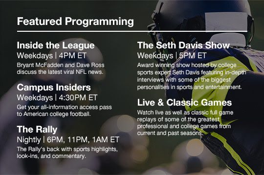 Alguna de la programación en vivo destacada es Inside the League, un programa que será transmitido de lunes a viernes a las 4:00 p.m. ET, conducido por Bryant McFadden y Dave Ross en el cual se hablará sobre la NFL. Otros programas destacados son Campus Insiders, The Rally, The Seth Davis Show y Live & Classic Games.