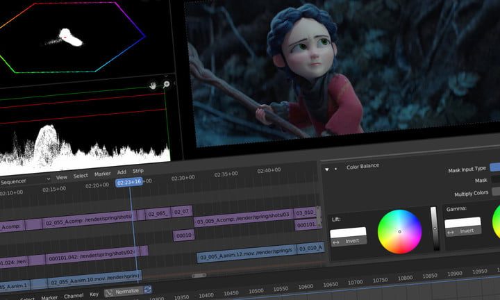 Junto con sus funciones 3D más avanzadas, Blender te permite realizar cortes y empalmes en tu video, a lo largo de una línea de tiempo detallada e intuitiva. También puedes realizar tareas como enmascaramiento de video y ajustes del color, para que tu video de salida se vea exactamente como lo deseas.