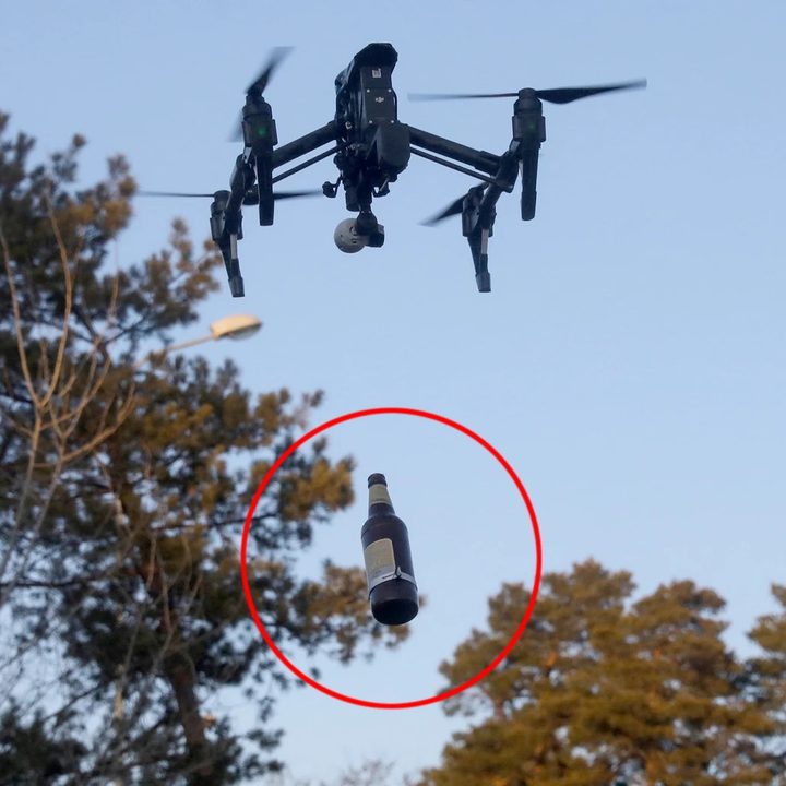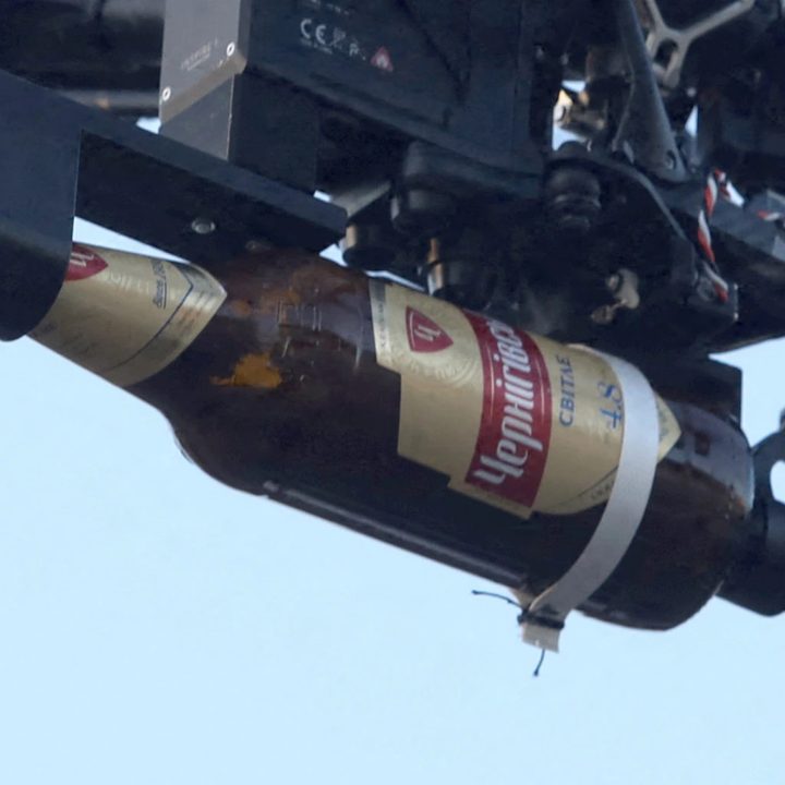 En fotos que revela Reuters, se muestra como el dron agarra de manera horizontal una botella de cerveza con la que se construyó el explosivo en la zona de Chernihivske, en Kiev.
