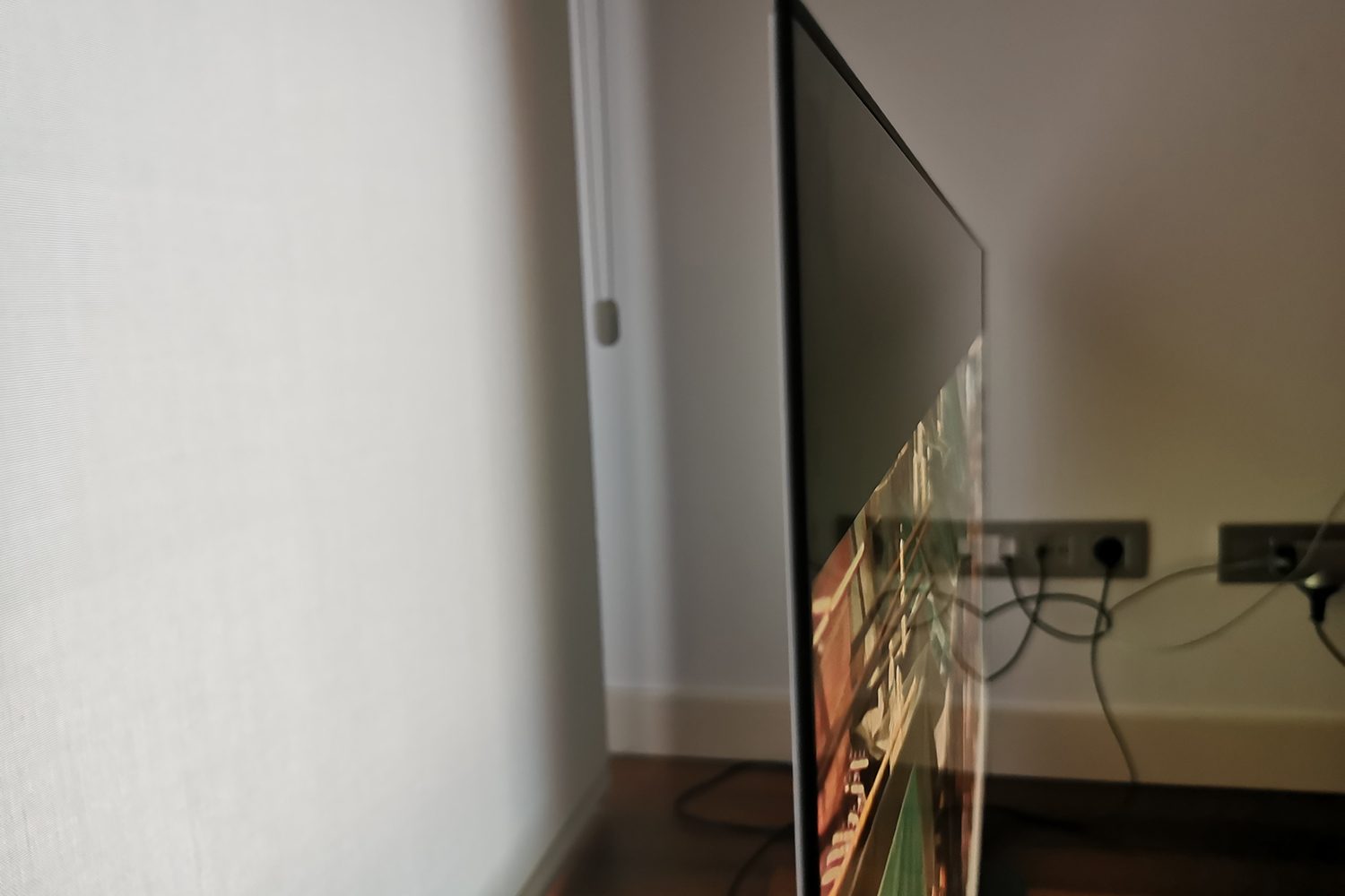 En la parte trasera (en la zona inferior), lleva integrados todos los componentes y por eso se ensancha considerablemente, así que si lo cuelgas en la pared no quedará completamente pegado, lo cual no debería suponer un problema. Por detrás de la pantalla, LG ha optado por un acabado gris oscuro en metal pulido, el mismo de la base. Se ve refinado, pero con todas las conexiones al descubierto, no es un televisor de esos que han cuidado muchísimo la estética por si no lo vas a poner arrimado a la pared. Para la conectividad, viene con cuatro HDMI, tres USB 2.0 y salida de auriculares.