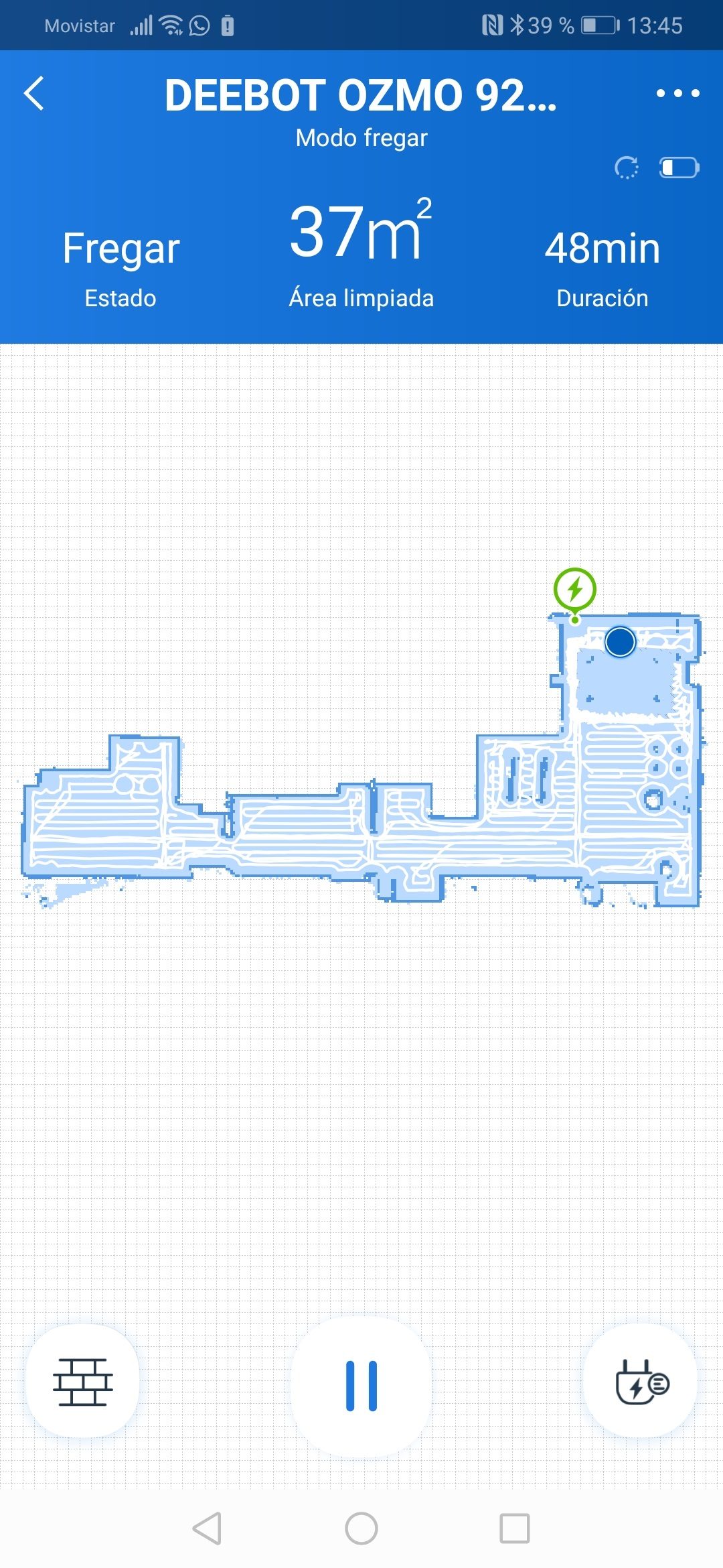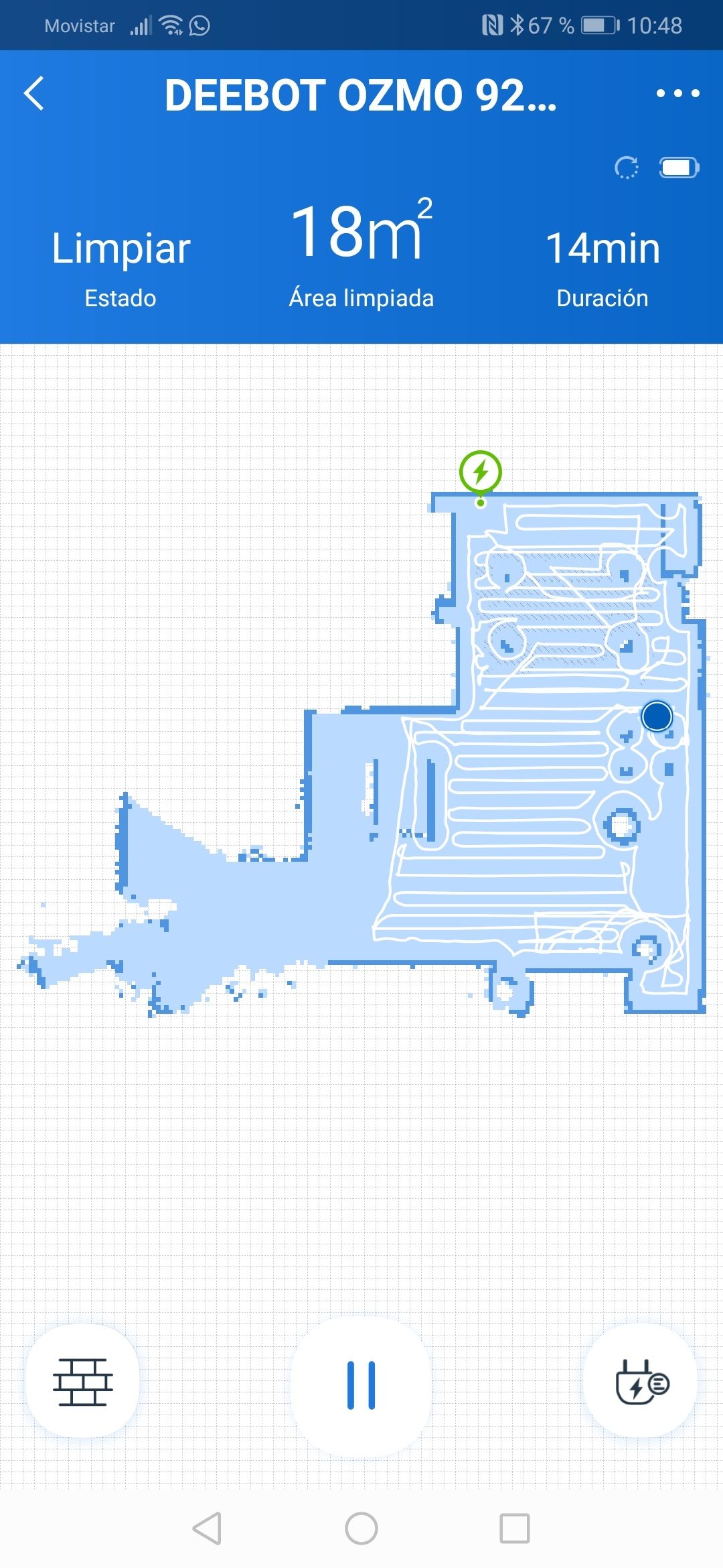 Una de las características que más nos han gustado de este modelo de Ecovacs es su tecnología de navegación y mapeo Smart Navi 3.0: en cuanto se pone a funcionar, el aspirador autónomo comienza a explorar el terreno a través de una cámara (sobresale en la parte superior del robot) y sensores. Así, en la app crea un mapa exacto de las distintas habitaciones de la vivienda (incluso de varias plantas). Cuando Deebot Ozmo 920 está aspirando, se puede ver en la app, desde cualquier lugar y en tiempo real, la ruta que sigue en todo momento (dibuja unas rayas blancas sobre el fondo azul del mapa).