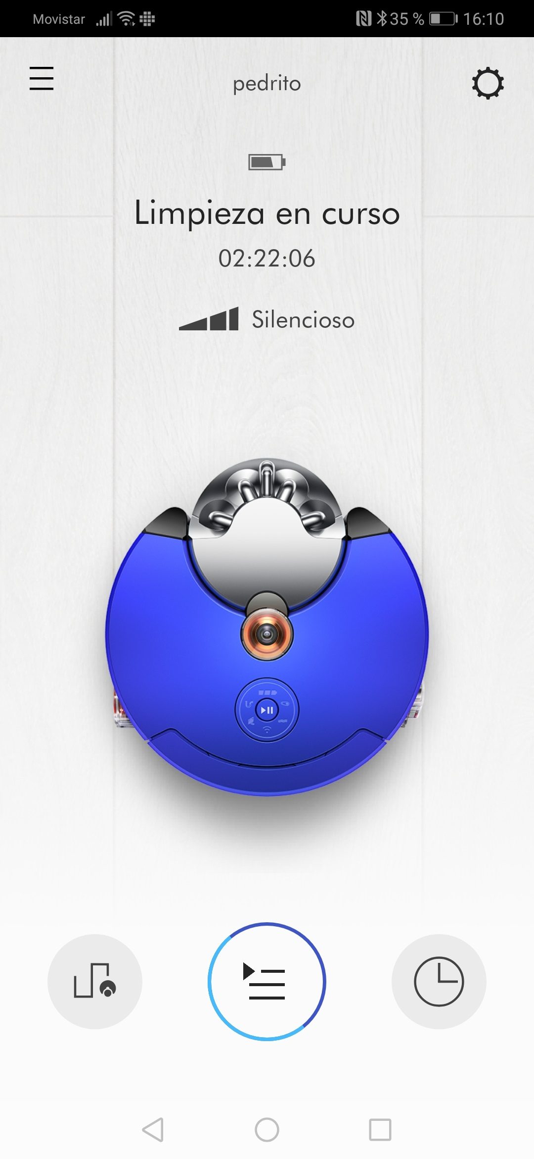 El robot se desplaza mediante unas pequeñas ruedas de goma de oruga (como las de los carros de combate). Para activar el aspirado, basta con dar al botón de encendido o en remoto desde la app Dyson Link. Desde esta aplicación, es posible elegir tres potencias: silencioso (no es silenciosa, pero si las más silenciosa de las tres ya que es la menos potente), alto y máxima potencia. Cuanto más potente, más ruido hace y más se consume la batería.