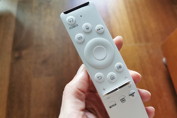 El mando a distancia o control remoto, de color blanco, tiene un tamaño muy manejable, y tiene pocos botones, por lo que es muy sencillo de manejar, aún más porque trae algunos para acceder directamente a plataformas de streaming (Netflix, Amazon Prime Video y Rakuten TV) y activar el asistente de voz.