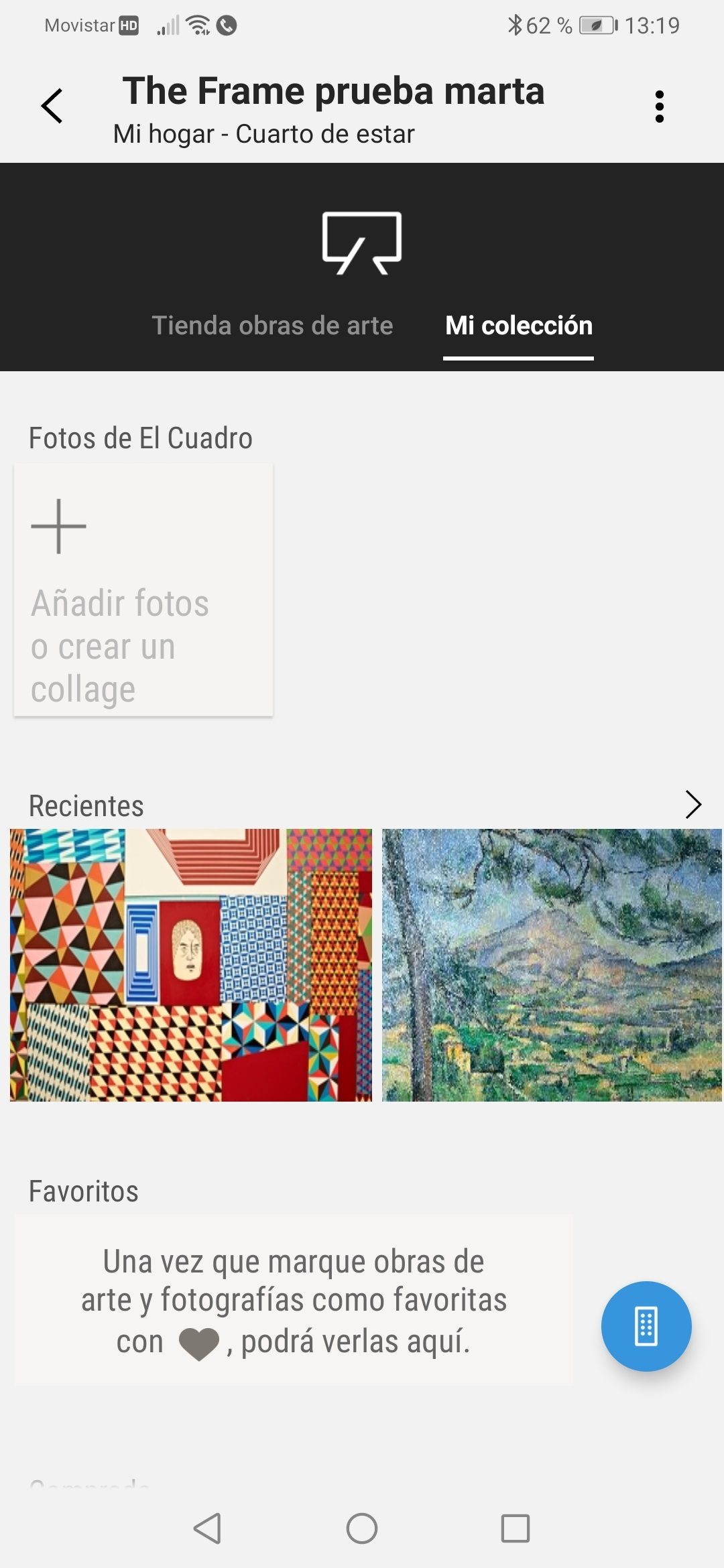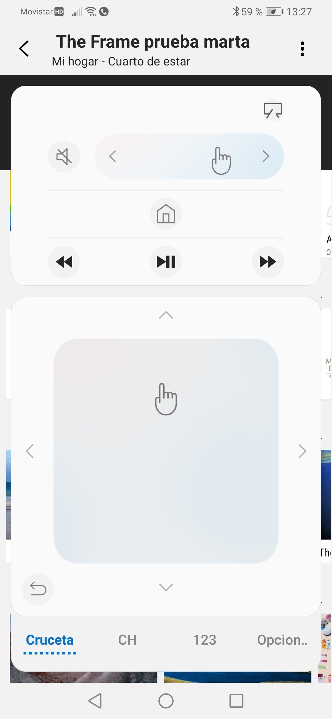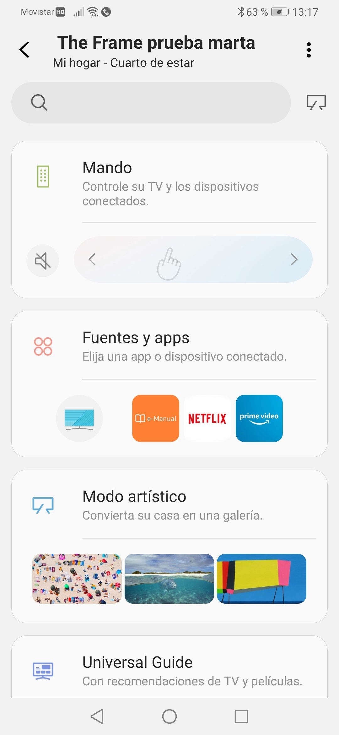 La aplicación de Samsung para el control del hogar posibilita usar el smartphone como mando a distancia para The Frame, con la ventaja de que tiene mucho más alcance y permite realizar prácticamente lo mismo que con el mando desde otra habitación distinta a la que se encuentra el televisor. Desde ella también se accede a la personalización de fotos con una aplicación de filtros que las convierte en pinturas, la tienda Art Store y una guía (Universal Guide) con recomendaciones de TV y películas. Pensamos que la mayoría de los usuarios se acostumbrarán fácilmente a manejar esta app tras vincularla al televisor.