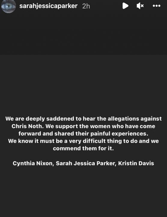 En una publicación en sus historias de Instagram, las actrices Sarah Jessica Parker, Kristin Davis y Cynthia Nixon dijeron encontrarse “profundamente entristecidas al oír las acusaciones contra Chris Noth. Apoyamos a las mujeres que han expuesto el caso y compartido sus lamentables experiencias. Sabemos que revelar algo así es muy difícil y las alabamos por ello”.