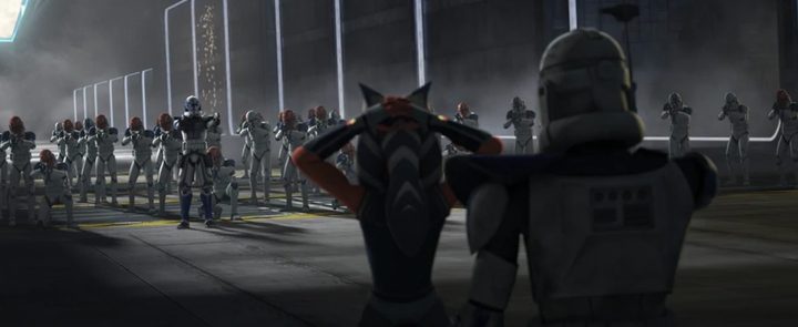 «Por eso, Tano corrió hacia el centro de mando e informó a Rex de que creía que algo terrible le había ocurrido a Skywalker. Sin embargo, los clones comenzaron a apuntarle con sus blásters en cumplimiento de la Orden 66. Uniéndose a ellos, Rex les ordenó bajar sus blásters para poder matar a Tano él mismo, con una lágrima cayendo por su cara mientras intentaba resistirse a su chip inhibidor, un implante orgánico en el cerebro de los soldados clon que les obligaba a cumplir la Orden 66. Con todo su cuerpo temblando, Rex pidió a Tano investigar sobre el soldado CAR Cincos antes de dispararle. Tano saltó para esquivar los disparos, corrió hacia Rex y lo empujó, encendiendo sus sables de luz para defenderse de los ataques del resto de clones, consiguiendo matar a dos de ellos. Entonces, cerró una puerta blindada mientras Rex empezaba a ponerse en pie, pero ella le golpeó la cabeza contra la consola de mando. No obstante, el soldado CAR Jesse y un grupo de clones llegaron, obligando a Tano a desviar su atención mientras todos los presentes le disparaban. Tano intentó dirigir los disparos hacia el techo en un intento de escapar. Mientas escapaba, los clones pensaban que la habían abatido, pero pronto descubrieron que Tano había huido a los conductos de ventilación de encima», extacto de Clone Wars de Disney Plus.