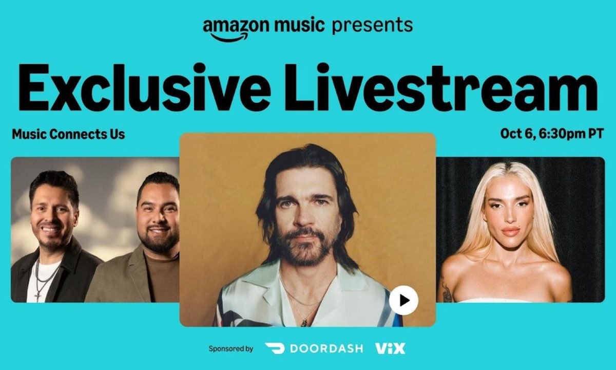 Como parte de la celebración de la música latina “La música nos conecta”, Amazon Music presentará una transmisión en vivo histórica a nivel global desde el popular local Academy LA el 6 de octubre. El evento se transmitirá en vivo y de forma gratuita en todo el mundo en Prime Video, el canal Amazon Music EN VIVO en Twitch (twitch.tv/AmazonMusicEnVivo) y dispositivos habilitados con Alexaa partir de las 6:30 p.m. PT / 8:30 p.m. CST / 9:30 p.m. ET.