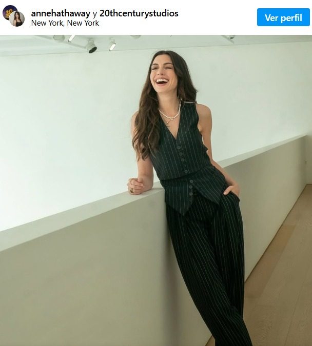 Al compartir la foto en Instagram, sin más comentarios que «Andy Sachs 2025», Hathaway luce vestida para el éxito con un chaleco y pantalones a rayas a juego, con perlas y un collar que acentúan el look.