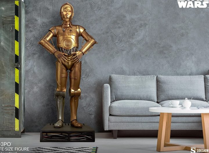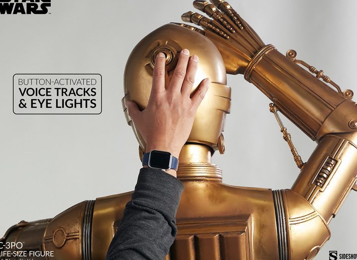 La compañía Sideshow además añade sobre su estatua de C-3PO que, “con fluidez en más de seis millones de formas de comunicación, la C-3PO Life-Size Figure viene programada con una función de pista de voz aleatoria. Puede recitar una serie de líneas icónicas de todas sus aventuras a través de la saga Skywalker utilizando el control remoto incluido. Sus ojos también incluyen una función de iluminación que se puede activar a través de un botón en la parte posterior de su cabeza. Dale un poco de vida a tu compañero droide con estas funciones interactivas, alimentadas por el cable externo incluido”.