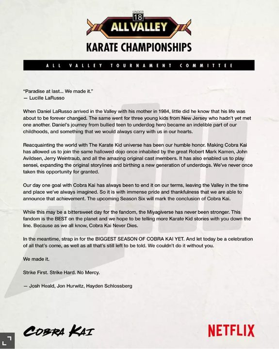 En una carta abierta a los fanáticos, los creadores Josh Heald, Jon Hurwitz y Hayden Schlossberg escribieron: “Nuestro objetivo del primer día con Cobra Kai siempre ha sido terminarlo en nuestros propios términos, dejando el Valle en el tiempo y lugar que siempre hemos imaginado”. Lea la carta completa a continuación: