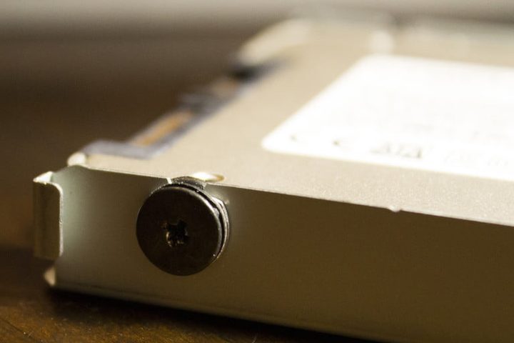 Una vez que sacas el disco duro, descubrirás que aún está protegido por una caja de metal que está cerrada con cuatro tornillos negros. Estos tornillos están ubicados a los lados de la caja, hay dos en cada lado. Sácalos con un destornillador de estrella estándar.