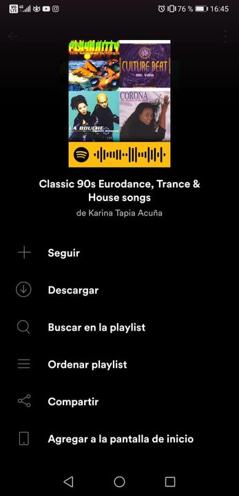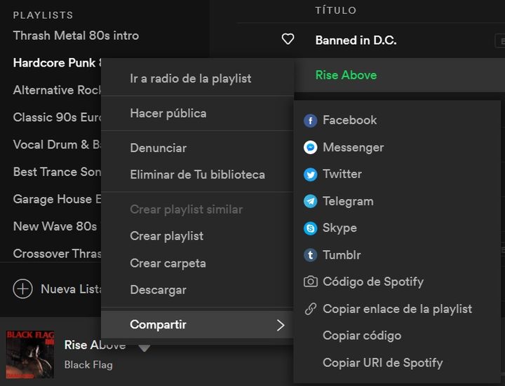 Igual que en la aplicación móvil, cada una de estas opciones se comporta de manera un poco diferente. La mayor diferencia con las opciones de compartir en la versión de escritorio son las últimas dos: Copiar código y Copiar URI de Spotify.