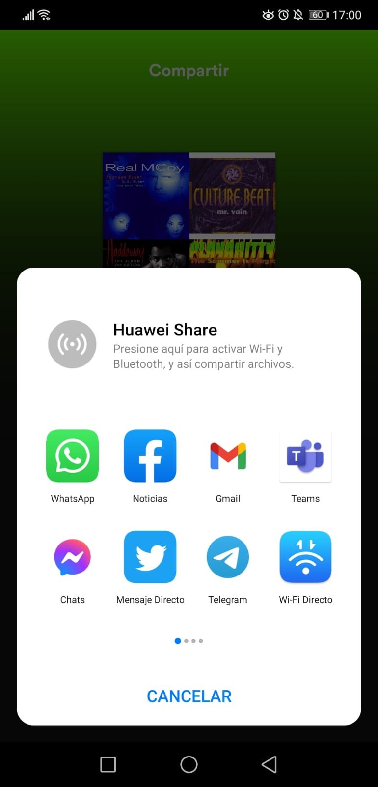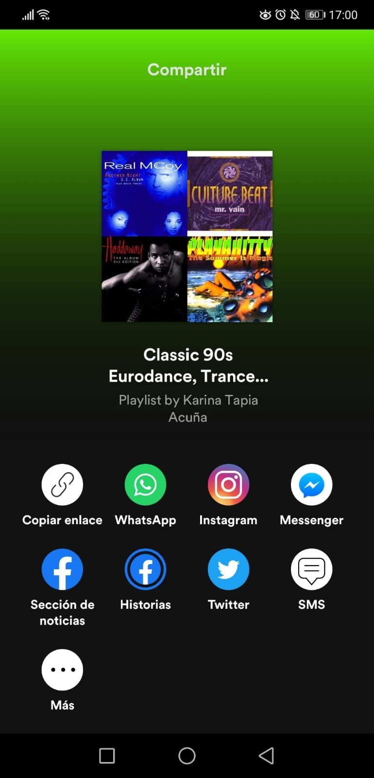 Para ver otras formas de compartir, desplázate hacia abajo hasta que encuentres la opción Compartir, que estará cerca del final de la lista. Al tocar Compartir aparecerá otra pantalla con todas las plataformas en donde puede compartir la playlist. Ten en cuenta que estas opciones para compartir podrían variar entre dispositivos, pero generalmente las que aparecen son las siguientes: