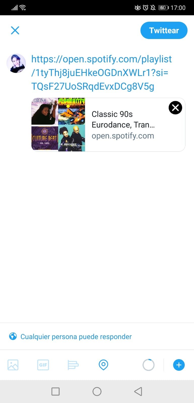 Sigue las indicaciones para compartir tu playlist por medio de estos servicios. Recuerda que no todos comparten del mismo modo. Twitter, por ejemplo, utiliza un enlace URL y llena automáticamente un tuit con él. No hay opción de mandar un Mensaje Directo. Al compartirlo por Facebook, se envía una imagen a la aplicación de Facebook con un botón personalizado de “Reproducir en Spotify”, que luego puedes compartir en tu muro o en una Historia de Facebook. Quien haga clic en el botón será dirigido al mismo reproductor web de Spotify al que te lleva Twitter.