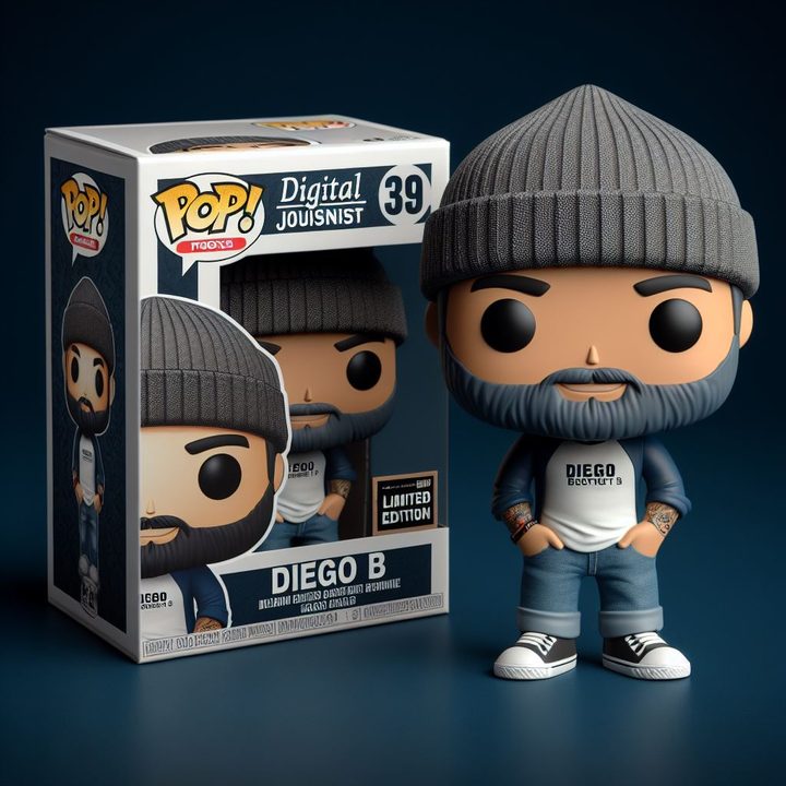 Por mi parte, introduzco el siguiente mensaje: Figura funko de un hombre latino con barba gris, sonriente, llamado Diego B, vestido con polera, jeans y zapatillas y con gorro. El Funko se muestra dentro y fuera de una caja Funko de edición limitada con texto Digital Journalist, lo que permite la visibilidad de la figura, la tipografía, el render 3D.