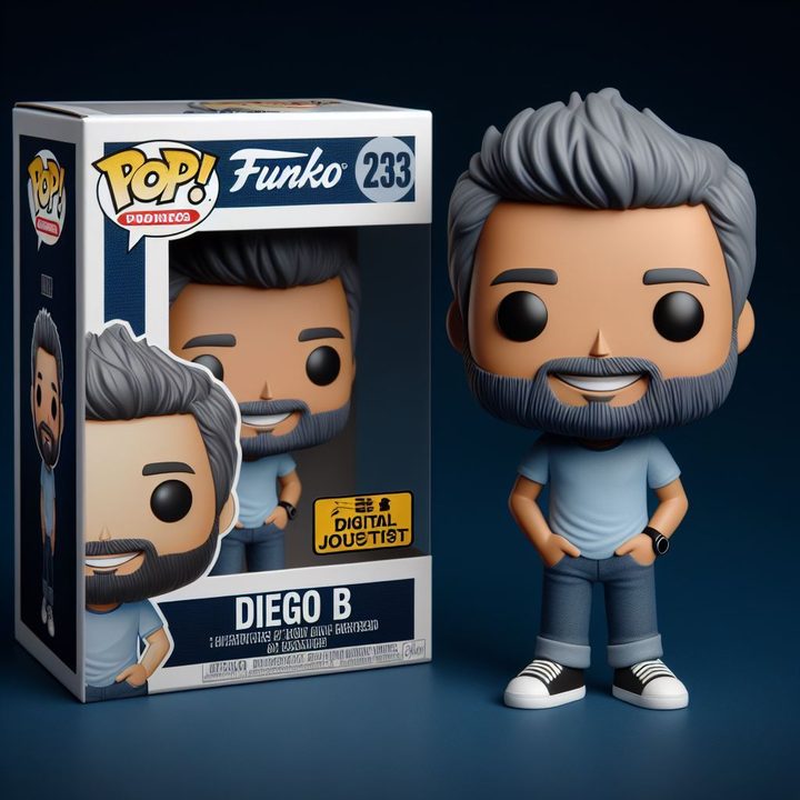 Por mi parte, introduzco el siguiente mensaje: Figura funko de un hombre latino con barba gris, sonriente, llamado Diego B, vestido con polera, jeans y zapatillas y con gorro. El Funko se muestra dentro y fuera de una caja Funko de edición limitada con texto Digital Journalist, lo que permite la visibilidad de la figura, la tipografía, el render 3D.